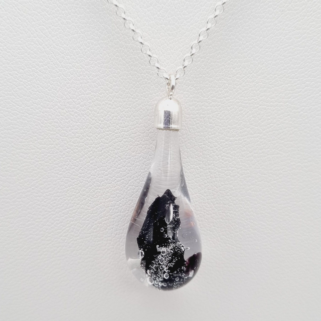 Bijou en verre filé au chalumeau dans mon atelier. Pièce unique recuite dans un four spécial à 500°C pour afin d'assurer la meilleure solidité possible en éliminant les tensions dans le verre dues aux différents temps de refroidissement lors de sa fabrication.