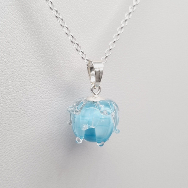 Bijou en verre filé au chalumeau dans mon atelier. Pièce unique recuite dans un four spécial à 500°C pour afin d'assurer la meilleure solidité possible en éliminant les tensions dans le verre dues aux différents temps de refroidissement lors de sa fabrication.