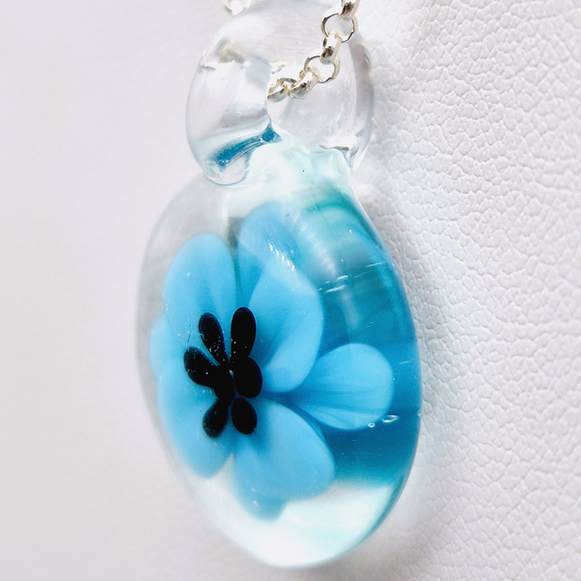 Bijou en verre filé au chalumeau dans mon atelier. Pièce unique recuite dans un four spécial à 500°C pour afin d'assurer la meilleure solidité possible en éliminant les tensions dans le verre dues aux différents temps de refroidissement lors de sa fabrication.